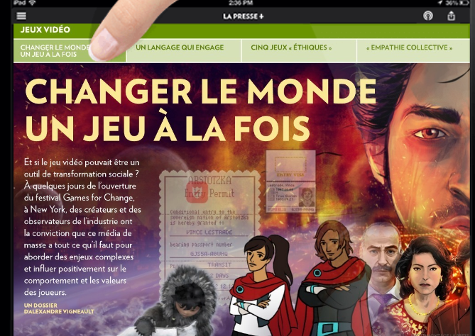 JEUX VIDÉO- CHANGER LE MONDE UN JEU À LA FOISEt si le jeu vidéo pouvait être un outil de transformation sociale ? À quelques jours de l’ouverture du festival Games for Change, à New York, des créateurs et des observateurs de l’industrie ont la conviction que ce média de masse a tout ce qu’il faut pour aborder des enjeux complexes et influer positivement sur le comportement et les valeurs des joueurs.UN DOSSIER D’ALEXANDRE VIGNEAULT